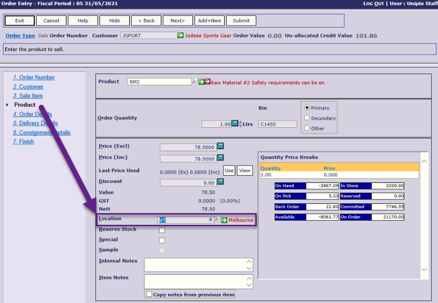 An example scenario of how you might use this is where you are entering a sales order for a NSW customer and the customer orders an item that you keep in Victoria (VIC). In this situation you can enter the order location as ‘NSW’ and add the order items as usual, then for the item located in VIC, enter that item on the order, but enter the line location as ‘VIC’. On saving the order, 2 orders are created – one to be picked in NSW and one to be picked in VIC.